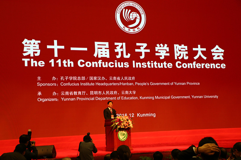 12月10-11日,第十一届全球孔子学院大会在云南昆明隆重召开,本届大会主题是“创新、合作、包容、共享”,来自140多个国家和地区的大学校长、孔子学院代表、相关国家驻华使节和中方承办高校代表等共计2200余人出席了大会。开幕式由教育部部长、孔子学院总部理事会副主席陈宝生主持,中共中央政治局委员、国务院副总理、孔子学院总部理事会主席刘延东出席并做主旨演讲。刘延东强调,当今时代,构建以合作共赢为核心的新型国际关系,携手打造你中有我、我中有你的人类命运共同体,是世界各国人民共同心声。孔子学院要深化教师、教材、教学法改革创新,拓展办学功能,提高办学质量,实现内涵发展。要发挥中外合作高校的积极性,完善理事会机制,促进合作办学深度融合。要推动孔子学院本土化发展,坚持开门办学,推动文明互学互鉴。要主动服务于“一带一路”建设战略,支持区域、国别之间孔子学院合作,努力惠及各国人民,为促进多元多彩文明发展作出新贡献。