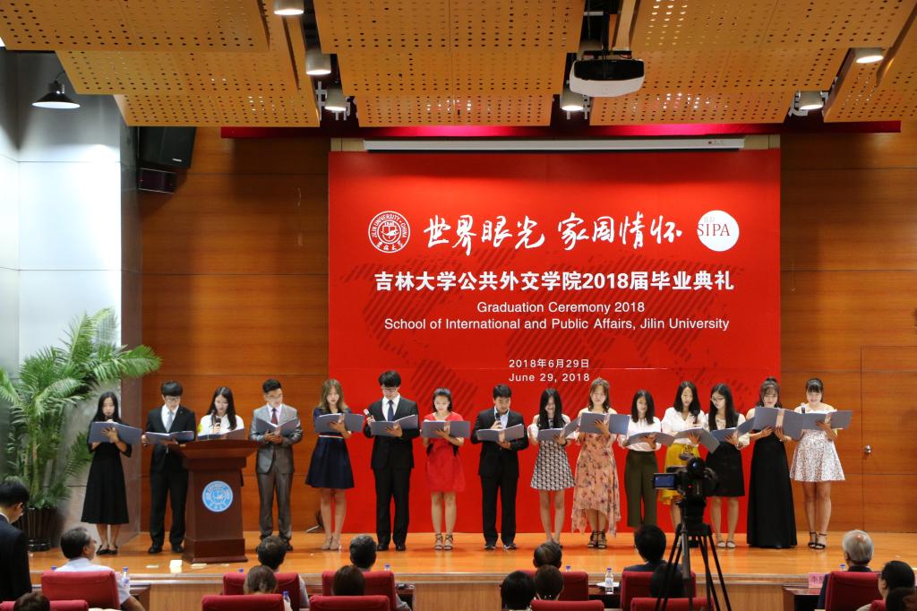 副院长孙兴杰副教授宣读了毕业生名单,院长刘德斌教授为他们一一颁发了毕业纪念名牌。教师代表颜震在讲话中首先对即将毕业的各位同学表达了祝贺与祝福。他回顾了自己的求学生涯和从事同声传译工作的经历,鼓励毕业生勇敢地探索属于自己的空间,不断开拓,超越自我。杨依众同学和来自乌克兰的玛丽亚同学分别发言,他们代表2018届毕业生同学向母院表达了诚挚的感谢和崇高的敬意,同时激励同学们无论是出国留学、在国内高校继续深造还是回到自己的国家,都要铭记学院和母校的教诲,利用所学,积极投身到各自的工作中,为世界发展和人类共同的美好未来做出贡献!随后,中外学生献上诗朗诵、合唱《那些花儿》、《Imagine》等演出,抒发了对母校的依依不舍之情和大爱天下的人道关怀精神,将典礼的气氛推向高潮。