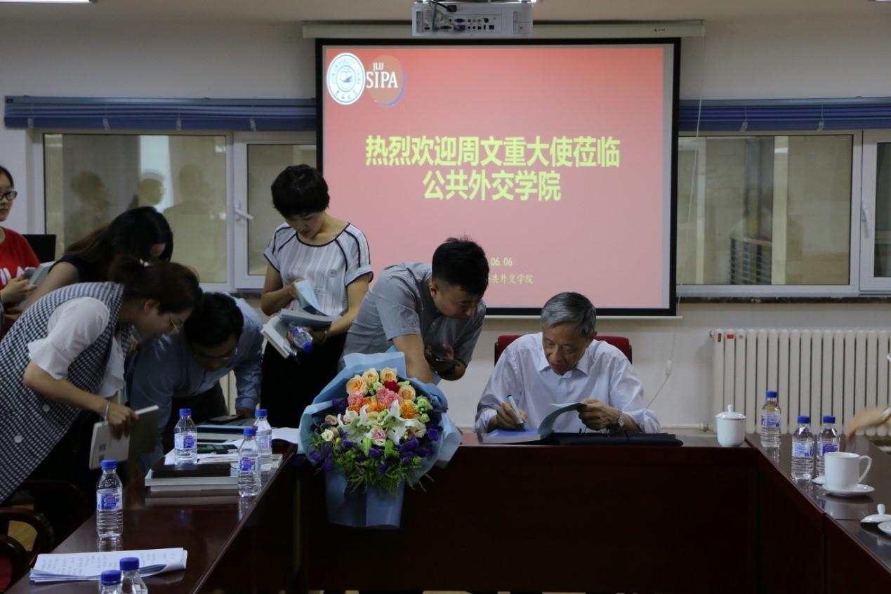 老院长刘德斌老师对周大使的发言进行了精彩的点评。学术座谈会结束后,周文重先生还将自己的两部著作赠予日本三级片