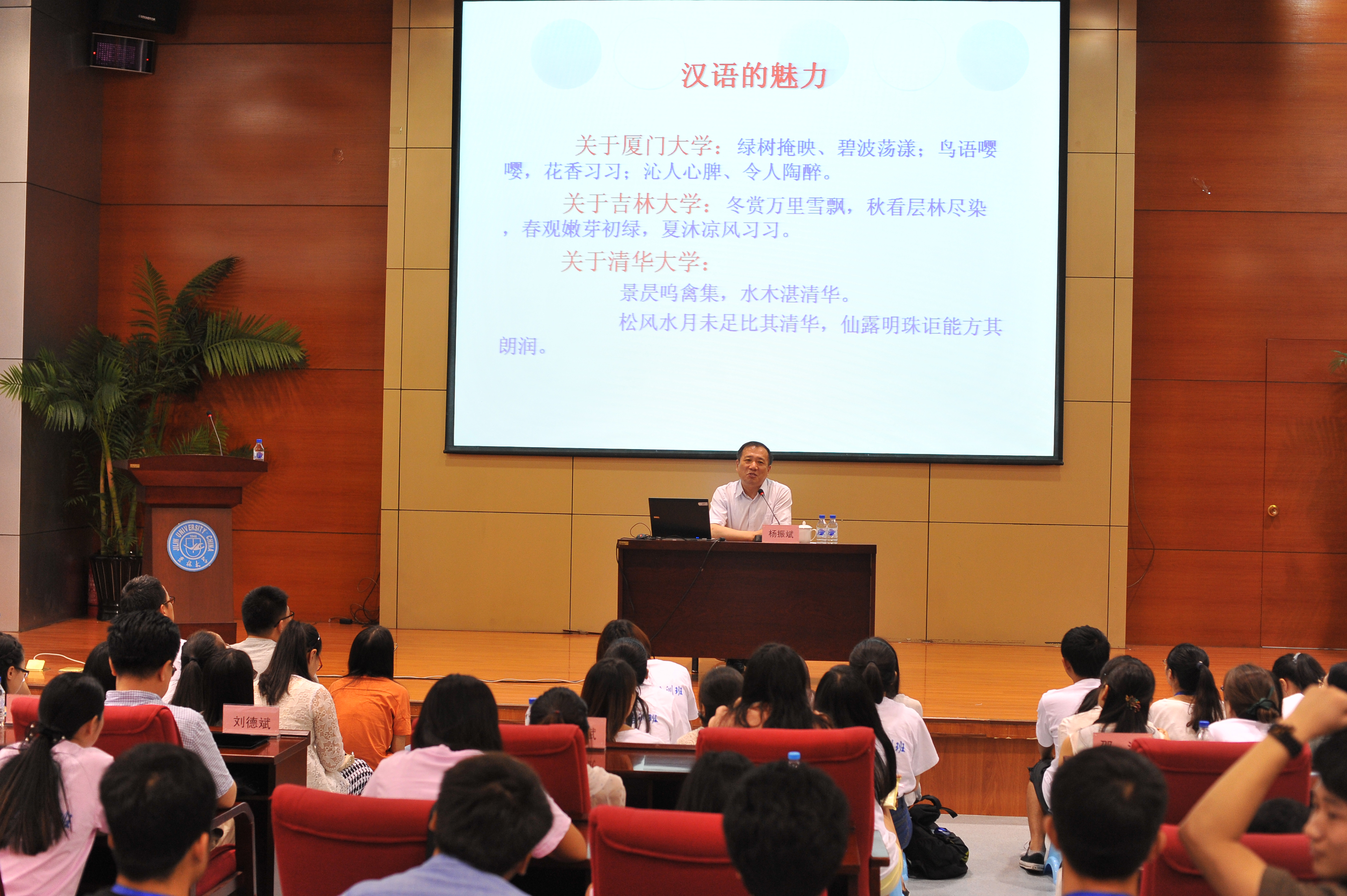 的原六所学校的历史沿革、合校以来学校的发展现状及近年来中国高等教育的发展形势。杨振斌从文明礼仪谈起,再到中外文化交流与孔子学院建设的战略意义,大学的社会担当及汉语教师与志愿者个人所应具备的素养,多方面、多角度娓娓道来,受到在场230多名学员的热烈欢迎。他特别强调了汉语教师和志愿者所应具有的国家意识和政治立场,勉励学员要有理论自信、制度自信和道路自信,坚定信念,不辱使命,并祝愿大家在工作中收获友谊、感受快乐。