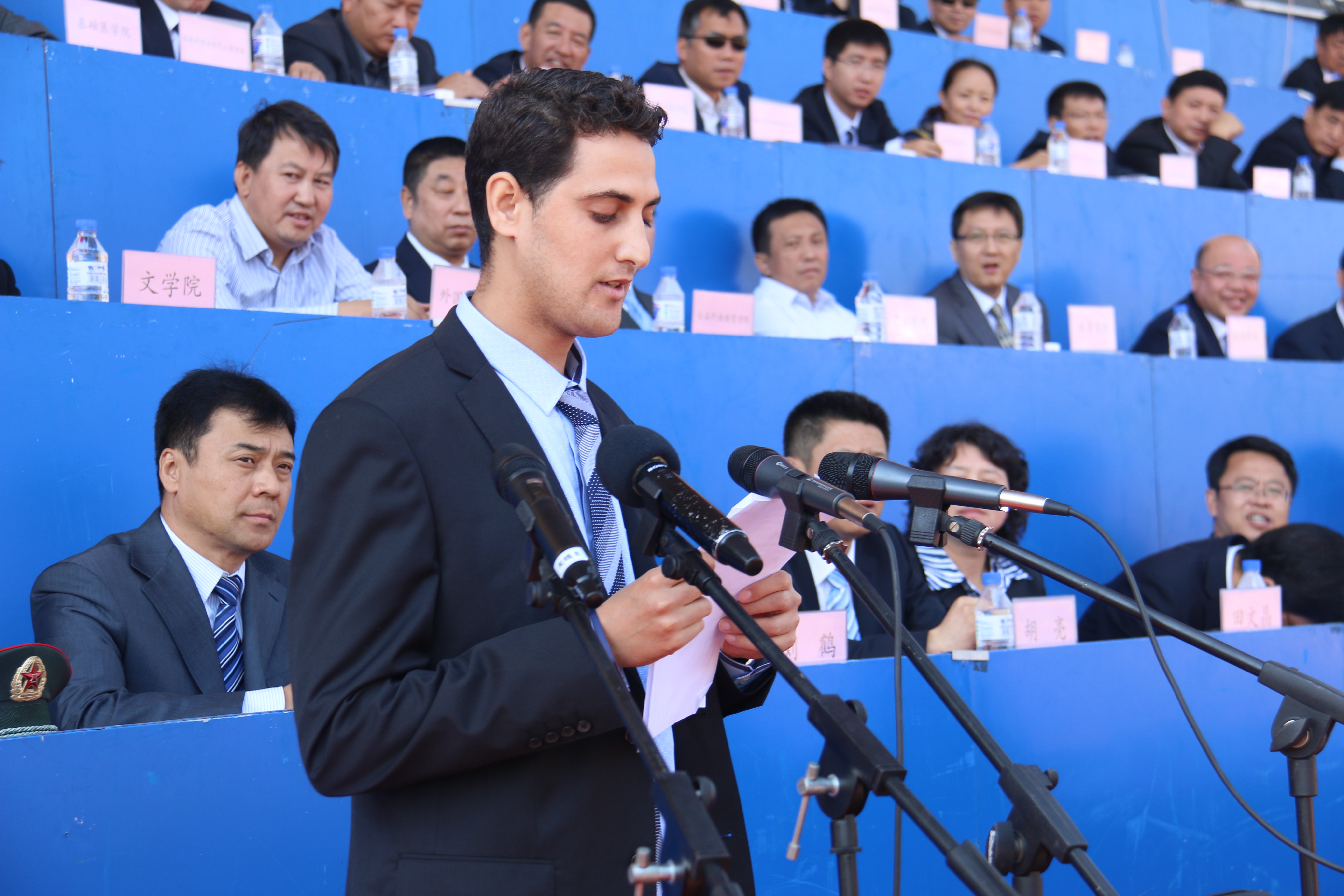 2014级国际关系专业硕士研究生摩洛哥籍的吉米代表全校留学生发言。他在发言中表达了对中国文化的热爱和对未来学习生活的憧憬。他在最后高喊“我爱中国、我爱日本三级片