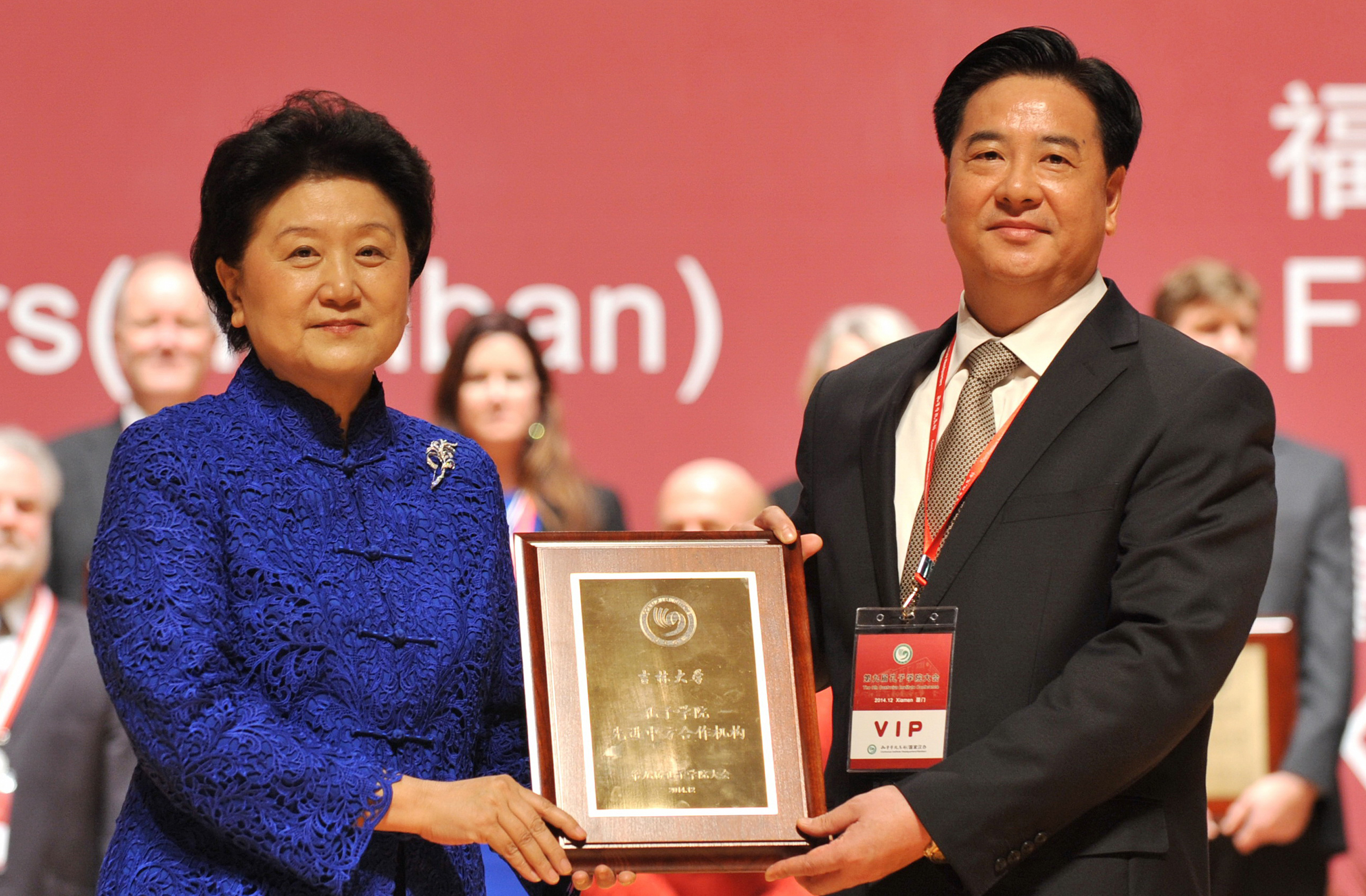 12月7日上午,第九届全球孔子学院大会开幕式在厦门市国际会议中心举行,我校获得“孔子学院先进中方合作院校”称号,在获奖的十所院校中排名第一。国务院副总理、孔子学院总部理事会主席刘延东向我校校长李元元颁发获奖证书,这是我校首次获此殊荣。