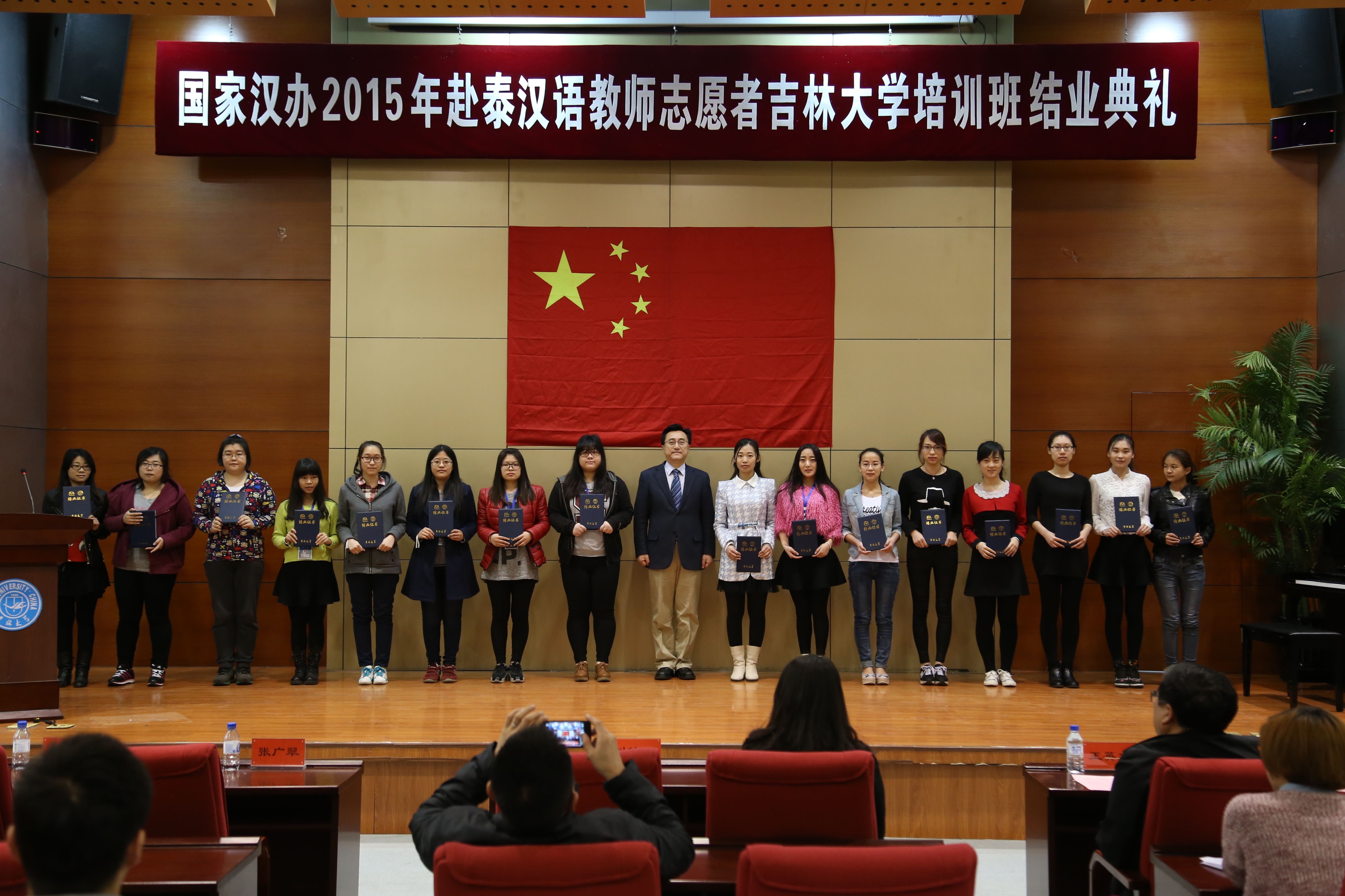 院长刘德斌分别为培训学员们颁发结业证书和优秀学员荣誉证书。在随后的致辞中,刘德斌教授表示,奉献精神是志愿者首先应该具备的品质,是实现人生理想和追求的途径;汉语教师志愿者应该将个人的前途和祖国的命运相结合,并以此为契机在未来为国家外交大战略服务;在吉大的培训和出国赴任也必将成为志愿者们生命中一段难忘的时光和个人事业发展的起点。