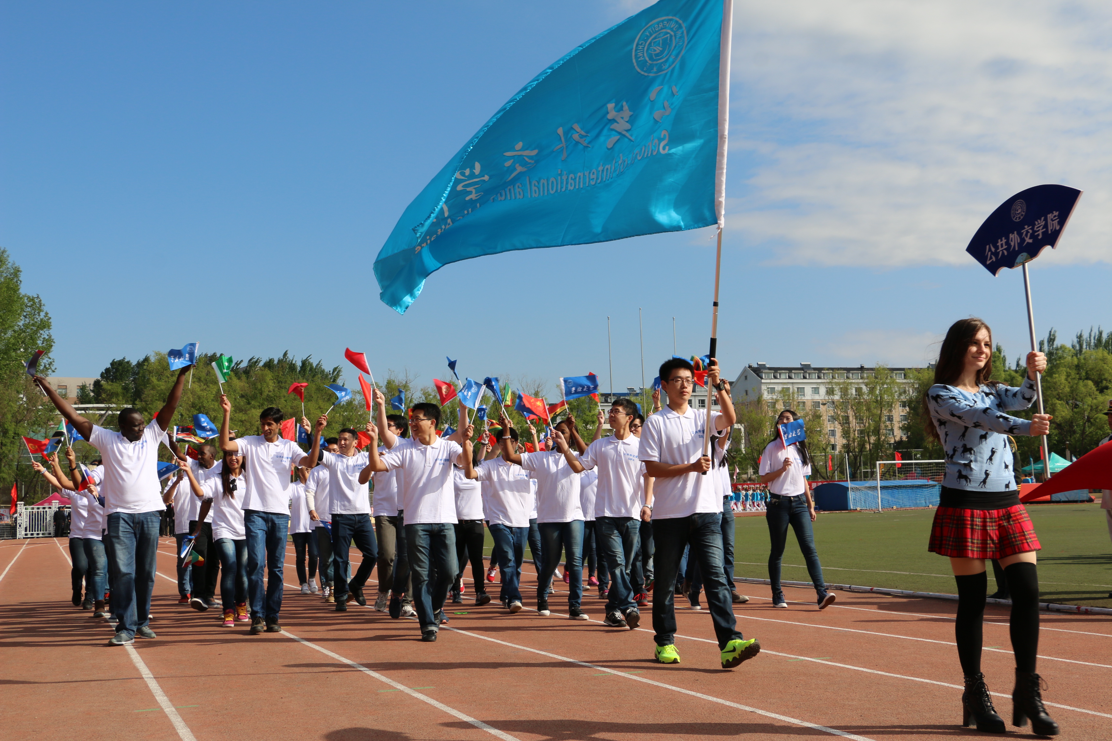 同学们起得比平时上课还要早,这全都是为了入场方队做准备。换上白底蓝字看起来高大上又小清新的院服,踏起飞扬的步伐,手拿各自国家的国旗和校旗,同学们激情洋溢地昂首走过主席台前。走在队首高举院牌的是来自乌克兰的留学生玛丽亚,她青春靓丽的身影引来观众席上的阵阵欢呼;旗手是体育委员梁鲁广,他飒爽的英姿显得分外帅气;方队的主体是由学院的首届中国本科生和留学生组成的,他们各自手挥国旗,迈着整齐地步伐,喊着激昂的口号,把日本三级片