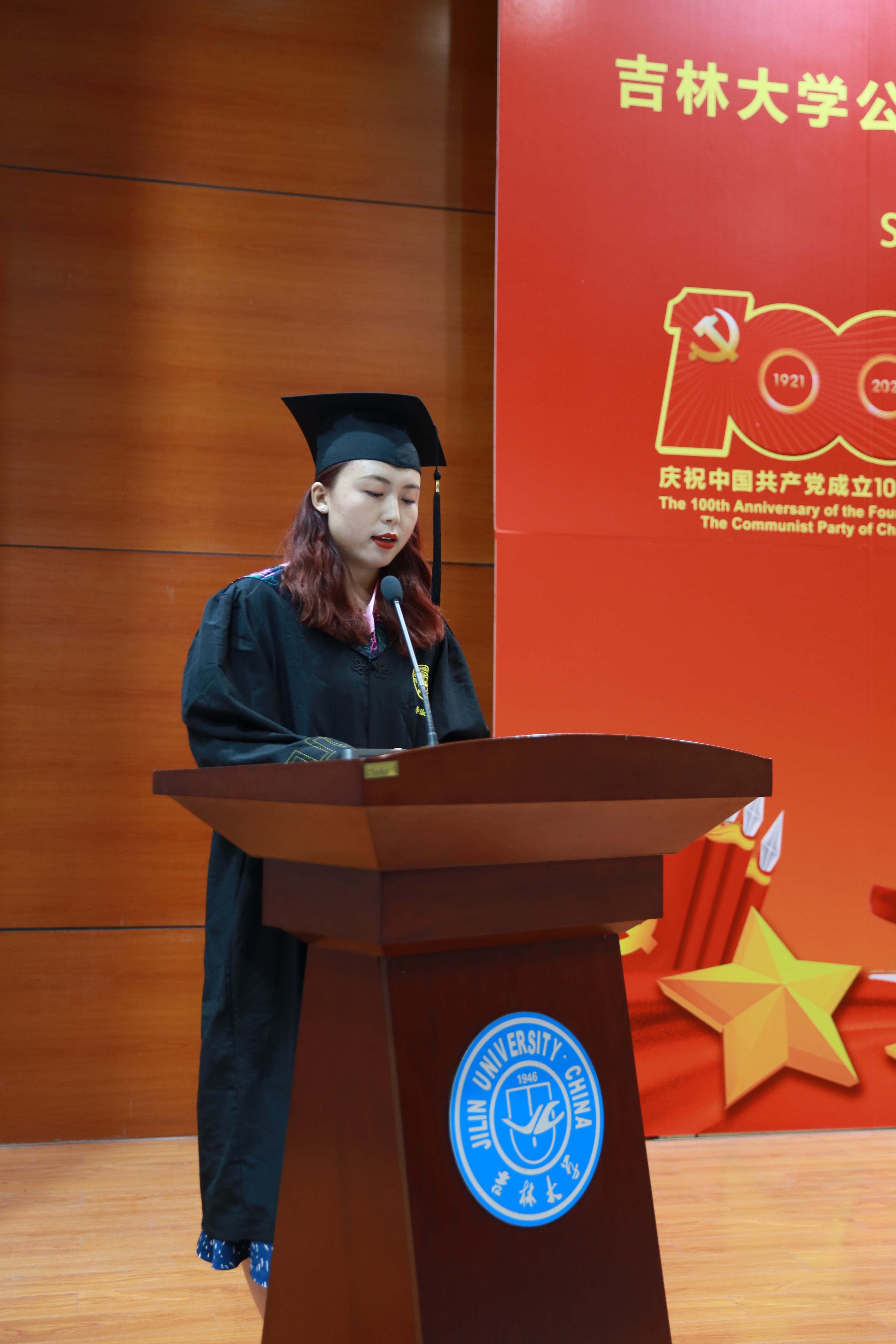 接下来,李淑琴同学作为毕业生代表发言。她从一名外交学本科毕业生的角度出发,回顾了大学四年的学习生活和成长历程,向所有老师们的付出和同窗们的陪伴表示衷心感谢。谈到自己远赴新疆的就业选择,李淑琴认为我国正处在实现“两个一百年”奋斗目标的历史进程之中,青年一代的理想、本领和担当,就是国家的前途和民族的希望。她号召青年人要充分认识自己所负的重任,不负祖国和人民的期待,勇做奋进者、开拓者和奉献者,积极投身新时代的征程。
