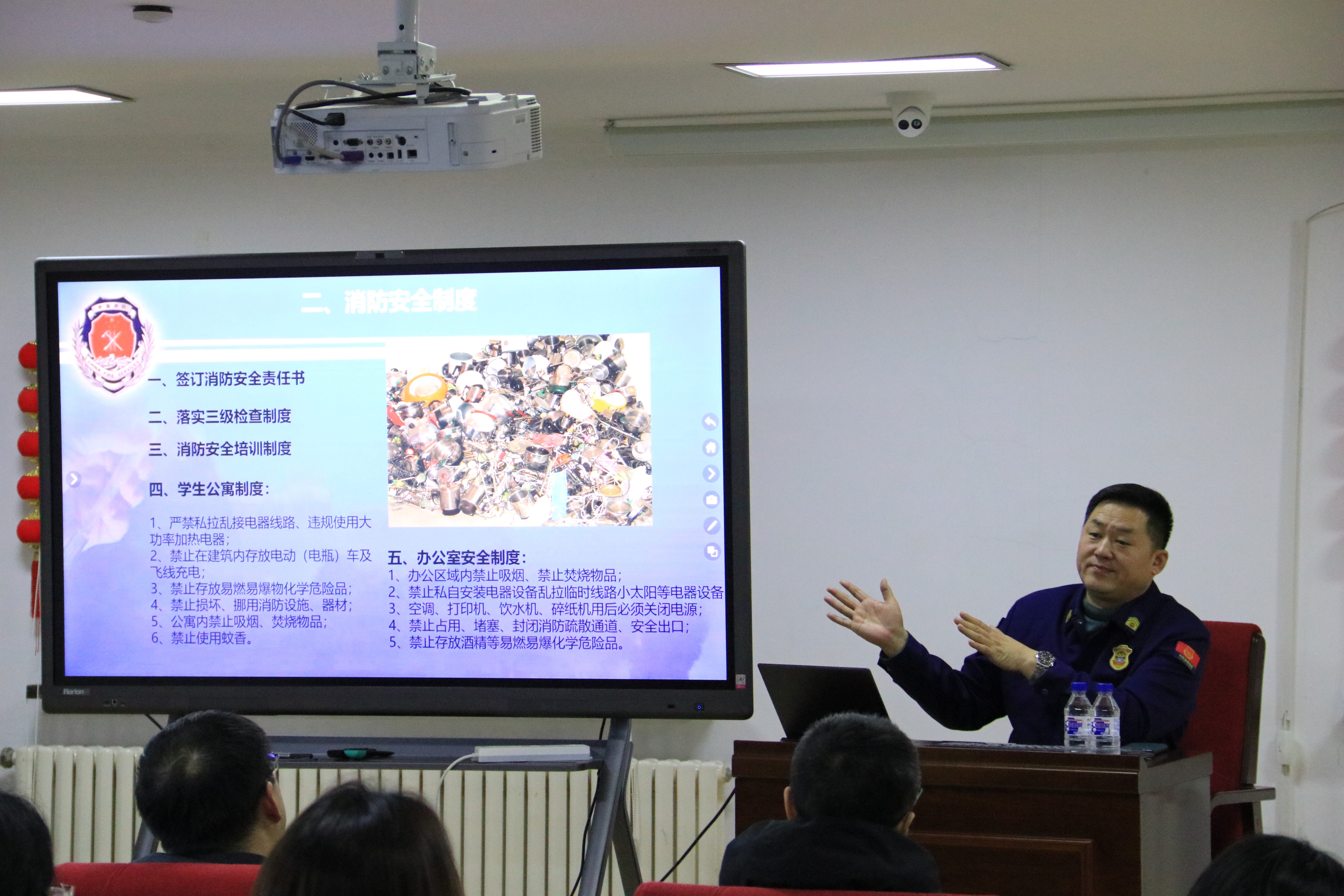 首先,董立明以近年来在不同学校发生的火灾事故为例,结合校园常见的消防安全隐患,从消防安全培训制度、学生公寓安全管理制度和办公室安全制度等方面强调了建立消防安全制度的重要性。他提出,学院师生务必要牢固树立安全意识,面对火灾危险要具备报警、逃生、自救的能力,要学会并掌握灭火器材的正确使用方法。