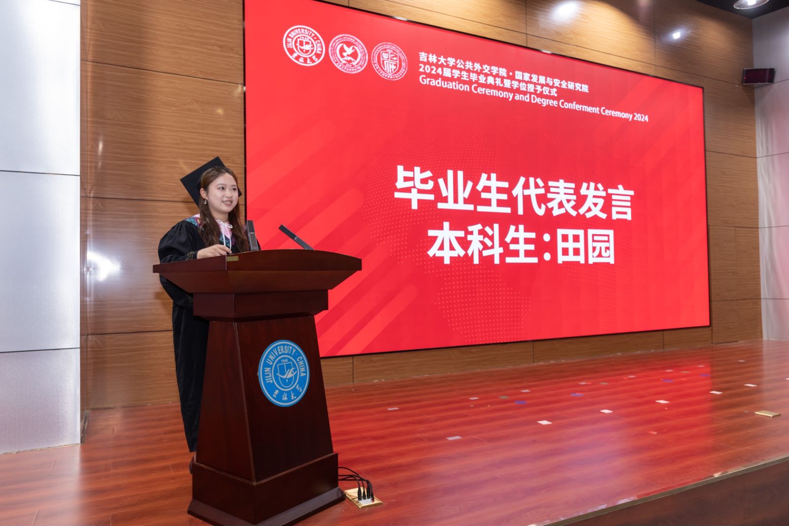 毕业生代表发言环节中,本科毕业生代表田园同学回忆了自身大学四年间的成长历程,向给予同学们谆谆教诲的老师们与朝夕与共、团结友爱的同学们致以衷心的感谢与美好的祝福,她呼吁同学们在新的人生旅程中须秉初心、知难上,戒骄狂,常自省,在新的时代洪流中持续学习,永葆青春风采。