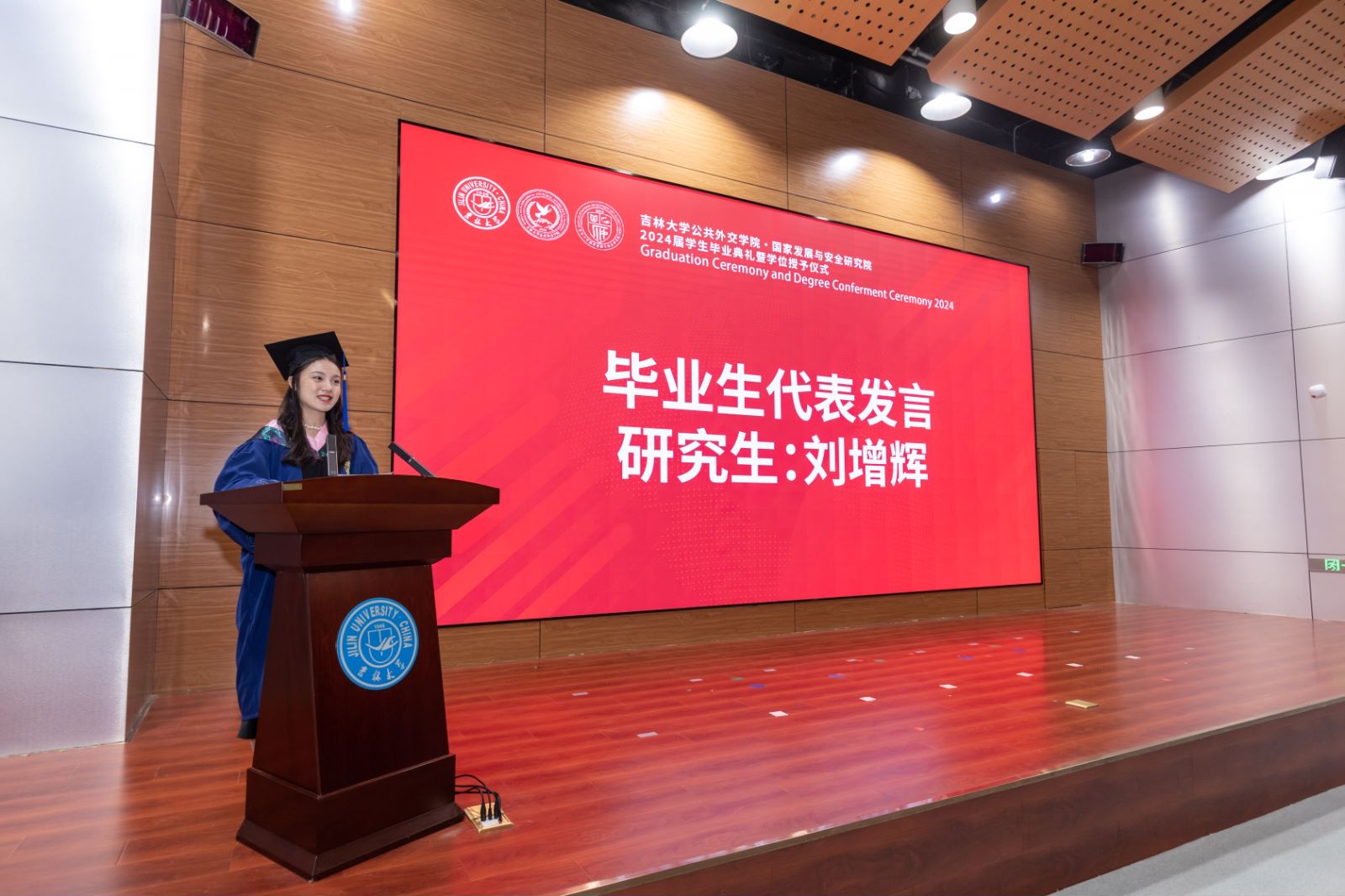 研究生代表刘增辉同学向学院老师和同学们的一路陪伴表达了诚挚的感谢与崇高的敬意,并与全体毕业生共勉,希望大家始终以追求真理为目标,求新、求精、求进,不断向真知的高峰攀登;希望大家无论坚守在何种岗位之上,始终葆有理解、尊重、宽容与合作的优秀品质,热爱祖国和人民;希望大家在未来的人生道路上,始终以勇气为帆,带着求学路上的所学、所见和所得勇毅前行,不畏艰险,踔厉奋发。