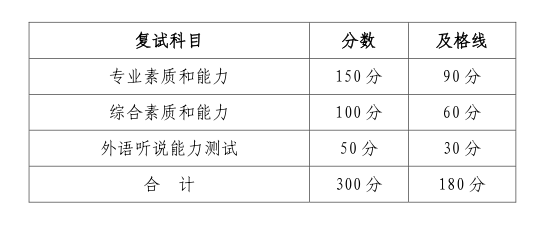 (一)复试成绩满分300分,复试中总分、专业素质和能力、综合素质和能力、外语听说能力测试任一项未达到及格线的考生不予录取。