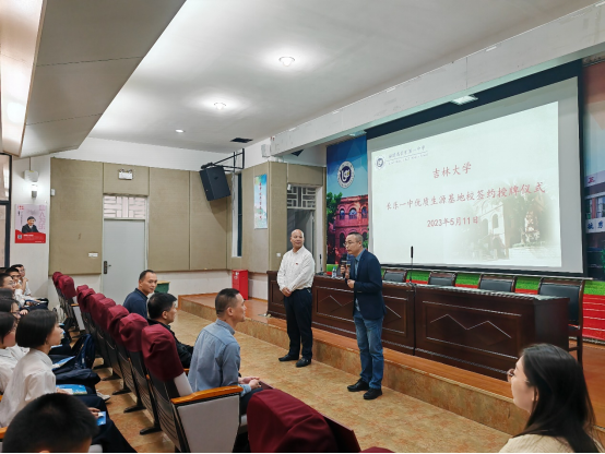 优秀生源基地”牌匾。 潘云朋校长与于洪生副院长就学校生源、人才培养、报考情况等亲切交流并合影留念。