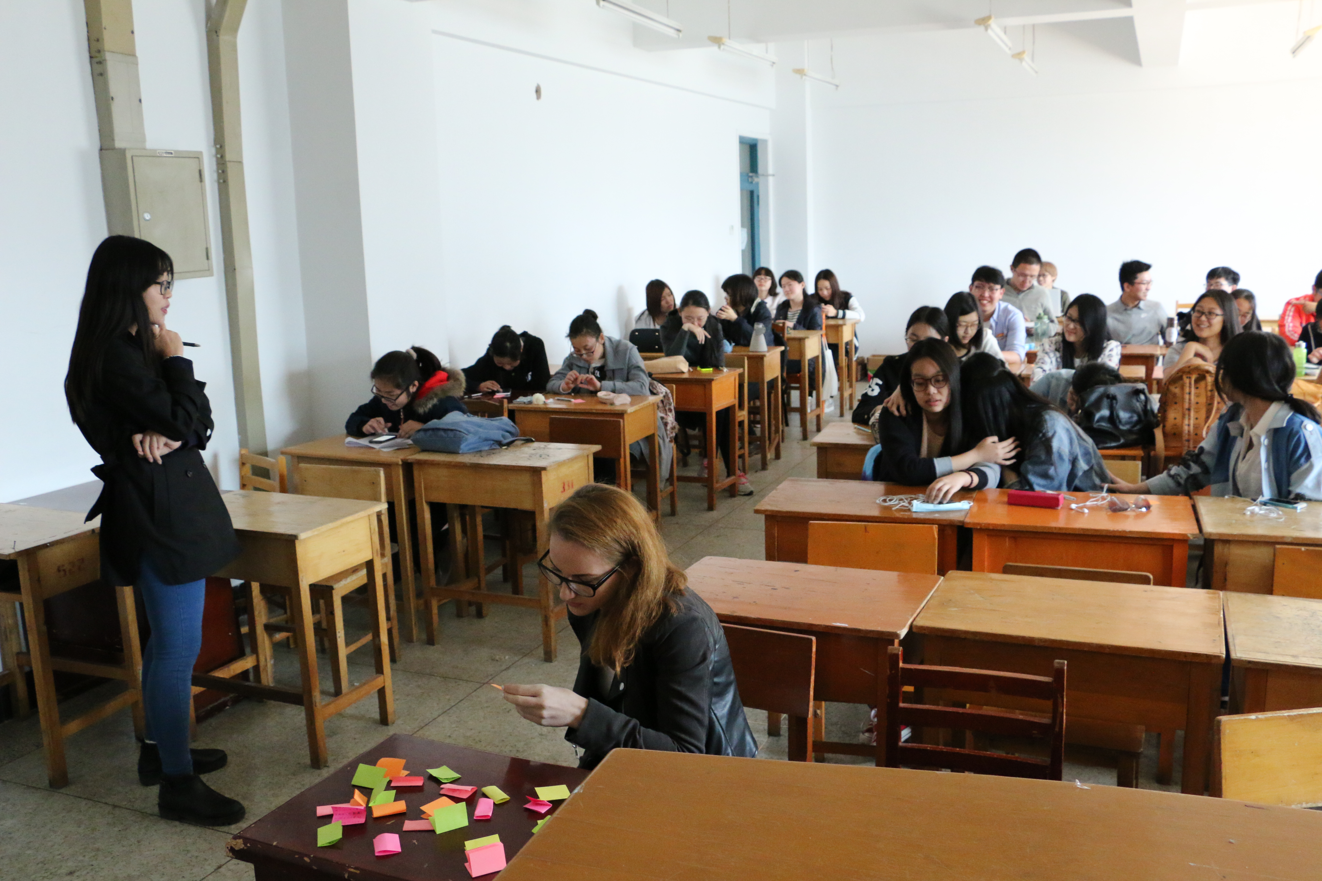 本次班会由大二心理委员崔嘉禾组织主持,大一心理委员戈萌协助。通过匿名写纸条的方式让大家自由的吐露出藏在心中的故事以及说不出口的问题。并通过随机抽 取同学念出纸条上的内容并给出相应建议的形式来帮助大家解决问题。整个班会气氛活跃,在放松了大家的身心的同时也为大家的迷茫与不解找到了适合的解决方 式,使得本次班会真正发挥了其应有的意义与作用,同时也得到了同学们的大力支持与广泛好评。