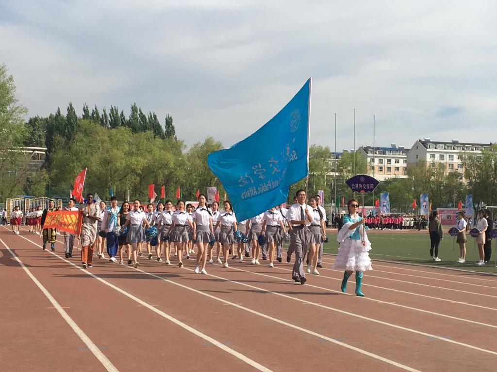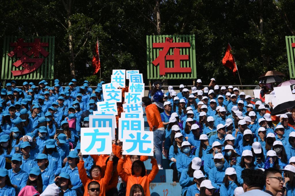 受阅同学以昂扬的精神面貌、嘹亮的口号、整齐的步伐走过主席台。“公共外交,志在四方,家国情怀,世界眼光”,随着口号声,看台上的同学们统一举起口号牌,向全校师生一展学院精神。