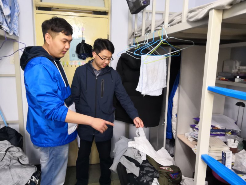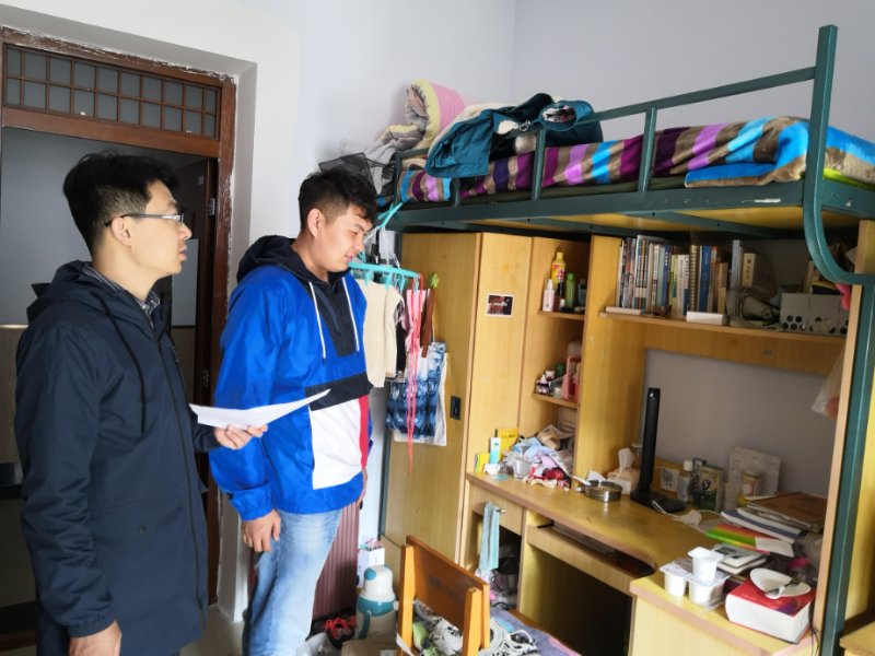 学生办公室主任王力老师和博士兼职辅导员孔泽鸣于4月29日下午对学院全部本科生寝室开展了安全卫生检查工作。