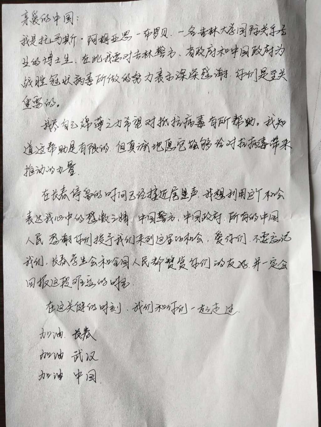 愉快的交谈过后,托马斯掏出了他用中文书写的感谢信。他在信中感谢中国政府、吉林省政府和警方为战胜冠状病毒所做的努力,并深情地写到,“在长春停留的时间接近尾声,希望尽自己的绵薄之力对抵抗病毒有所帮助,感谢中国政府、警方和所有的中国人民给我们机会来到这里,请不要忘记我们,在这艰难的时刻,我们和中国人民在一起。加油,中国!加油,武汉!加油,长春!相信在大家的共同努力下,一定能打赢这场没有硝烟的战争。”随后,前进大街派出所联系学校保卫处和学院,将托马斯的优秀事迹通报给学校,向日本三级片
