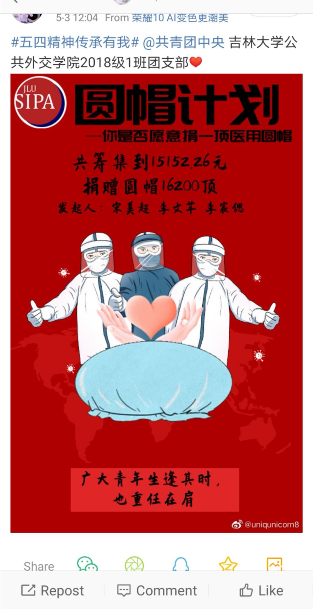 为此,2018级1班团支部在“五四”青年节来临之际精心制作了宣传海报,前期经过仔细构思,以“圆帽计划”为支部抗疫代表活动进行宣传;海报制作期间经过细致排版,支部团员亲手绘制圆帽形象,中间的爱心代表着医护人员为抗击疫情奉献的真心,也代表着广大青年投身于建设祖国的坚定决心。希望通过此次“圆帽计划”宣传活动带动广大青年发扬爱国主义精神,鼓励青年勇于承担责任,为祖国贡献自己的力量。海报制作完毕后,我支部通过各种网络平台进行宣传,并@共青团中央,参与#五四精神传承有我#活动。