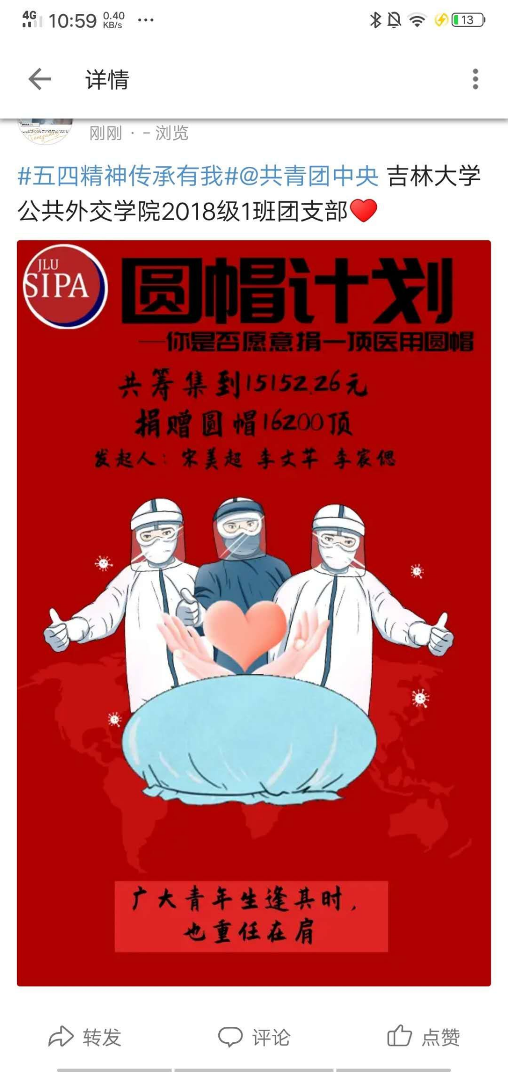 2018级1班团支部将支部优秀青年志愿者为疫情防控所做出的贡献制作为海报,在微博等网络视频平台@共青团中央参与#五四精神传承有我#活动进行宣传,激励支部青年在党和人民最需要的地方贡献力量、绽放青春。