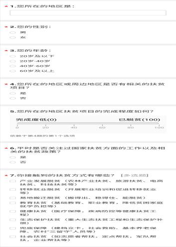 在线下访谈的同时,团队面向社会大众发放了“关于扶贫攻坚的相关调研”线上问卷,就全国不同省份扶贫项目数量、扶贫方式、扶贫工作效果等问题进行了探究,同时对团队的线上线下访谈调研结果进行了补充和完善。