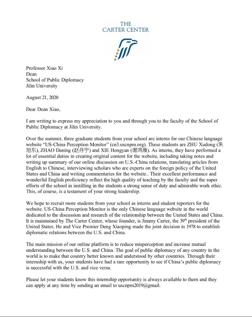 发来感谢信,对学院四名学生在卡特中心中国项目部主办的中美印象网站实习期间的优异表现表示高度的赞扬和感谢。