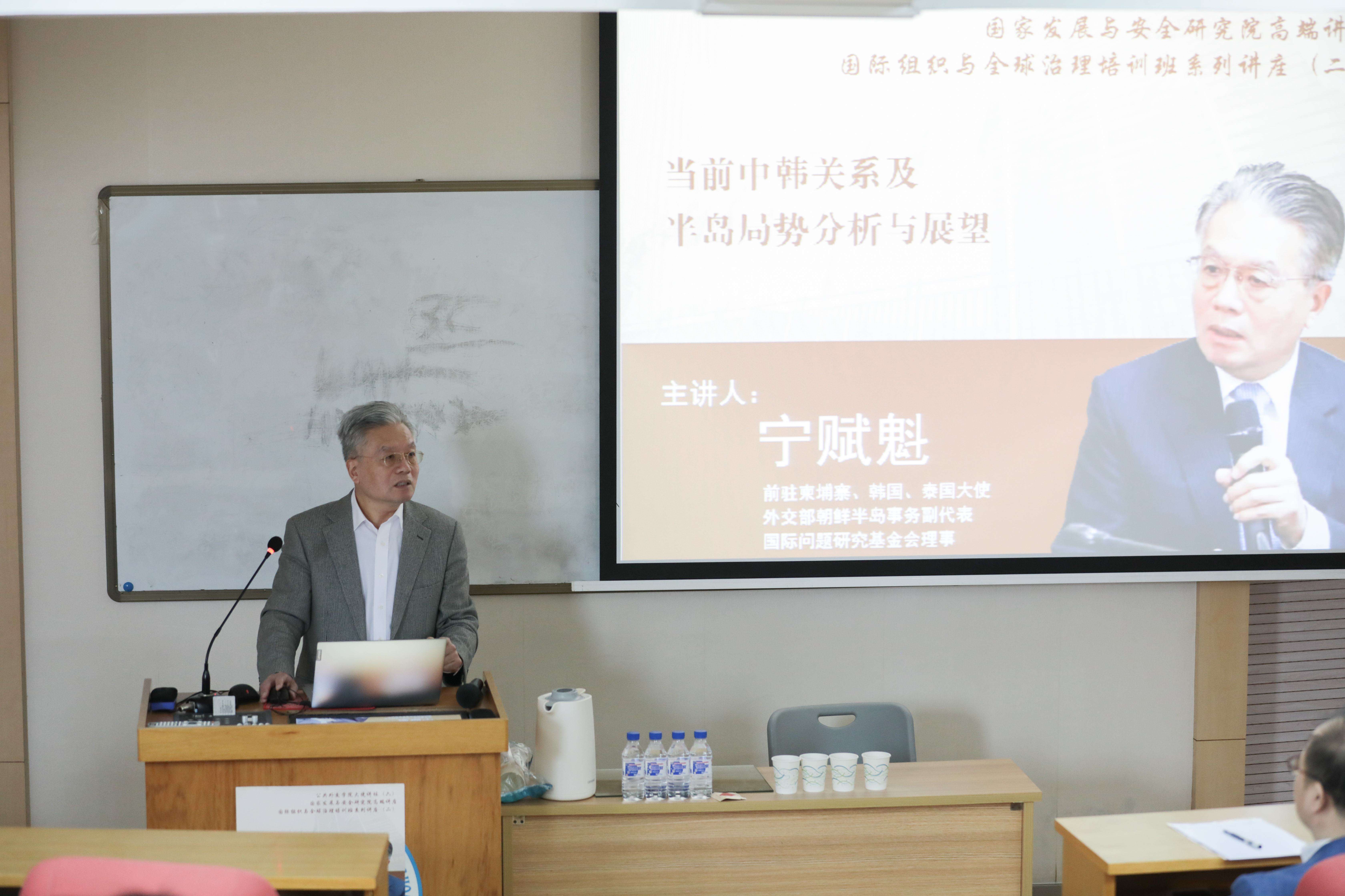 4月25日上午,前驻柬埔寨、韩国、泰国大使,外交部朝鲜半岛事务副代表,国际问题研究基金会理事宁赋魁大使作题为《当前中韩关系及半岛局势分析与展望》专题讲座。讲座由国家发展与安全研究院副院长郭锐教授主持,日本三级片