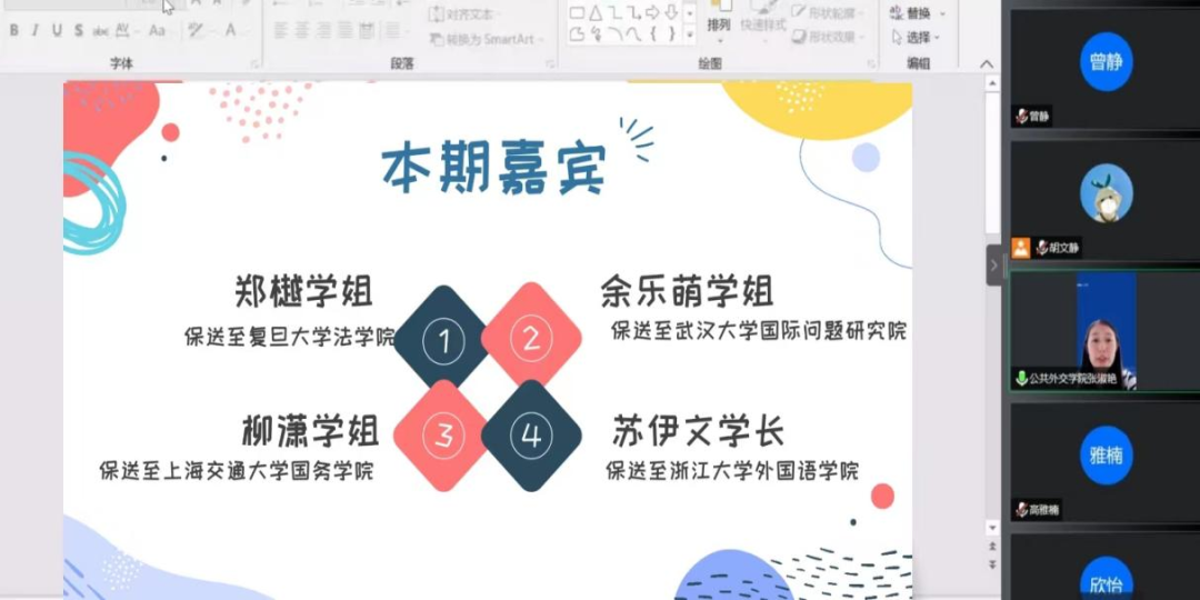 2019级本科生郑樾、余乐萌、柳潇、苏伊文为大家分享保研过程中的心得体会。本期分享会由2021级本科生温乐言同学主持,学院辅导员张淑艳老师和各年级SIPAer们参加。