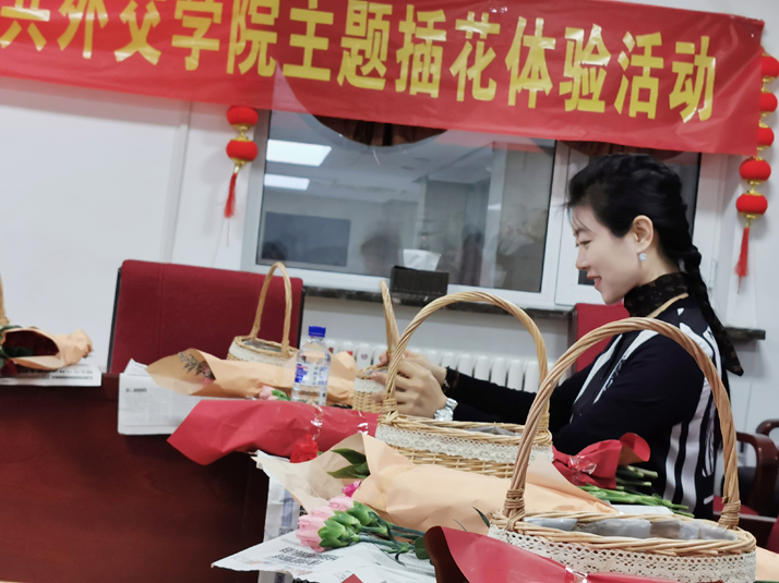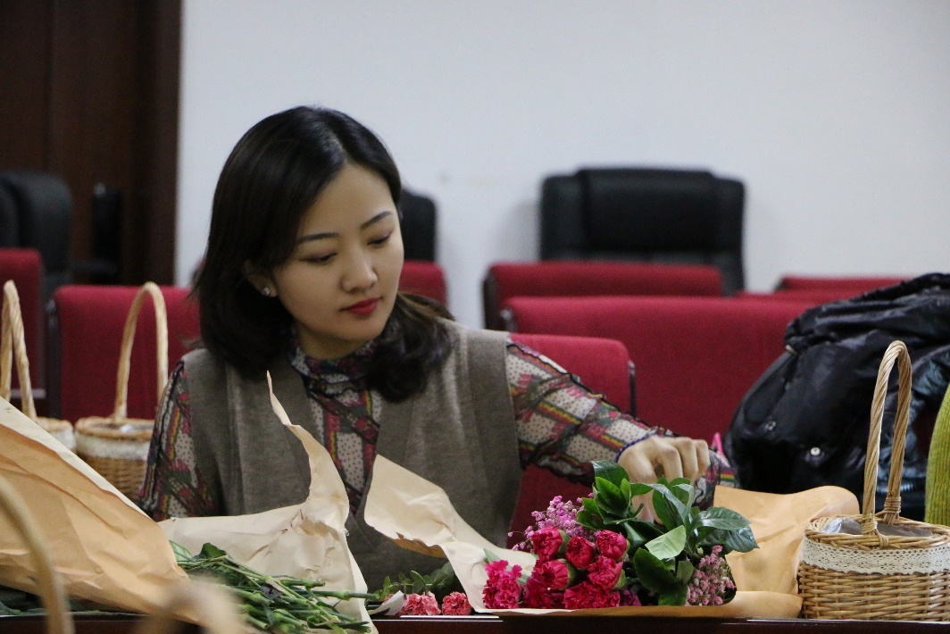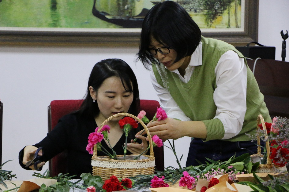 活动伊始,在学院行政楼大会议室沁人心脾的中,老师向参与活动的教师介绍了插花的发展历史,普及了鲜花和家庭盆栽的养护知识,详细讲解了插花的要领及技法,并进行了插花演示。置身于鲜花丛中的老师们兴致盎然,认真聆听老师讲解。